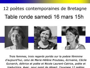 12 poètes contemporaines de Bretagne table ronde 16/03/2024 Printemps des poètes et Journée Internationale des femmes, médiathèque Floresca Guépin Nantes. Trois femmes, trois regards… Lire la suite Type d'événement Rencontre