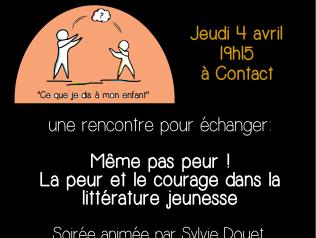 Soirée ce que je dis à mon enfant 04/04/2019 Une soirée pour échanger sur le traitement de la peur et du courage dans la littérature jeunesse. Lire la suite Type d'événement Rencontre