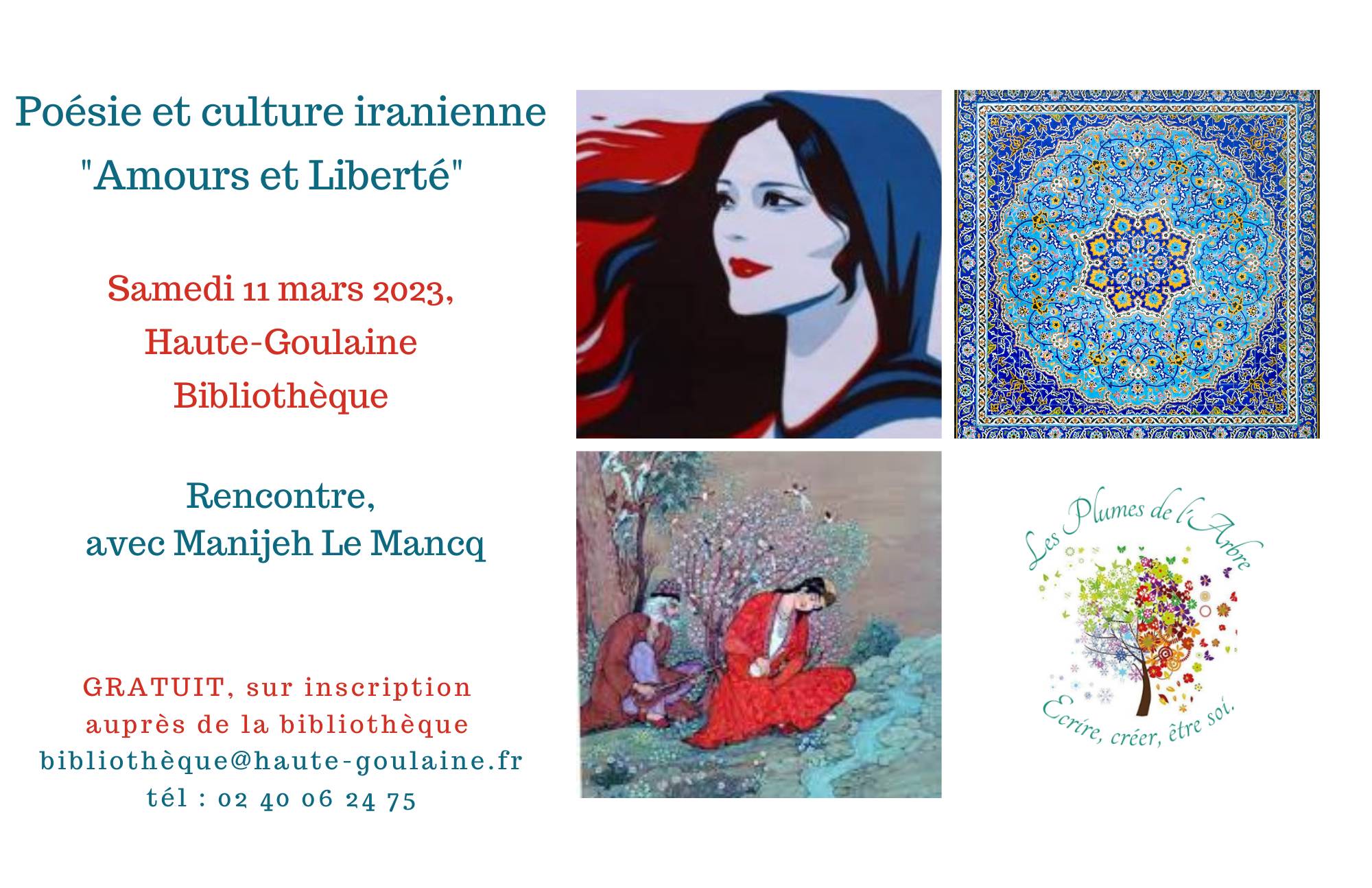 Samedi 11 mars 2023, la bibliothèque de Haute-Goulaine et les Plumes de l'Arbre vous proposent de rencontrer la poésie persane et iranienne avec Manijeh Le Mancq.