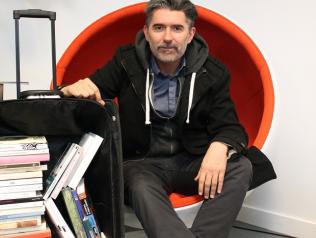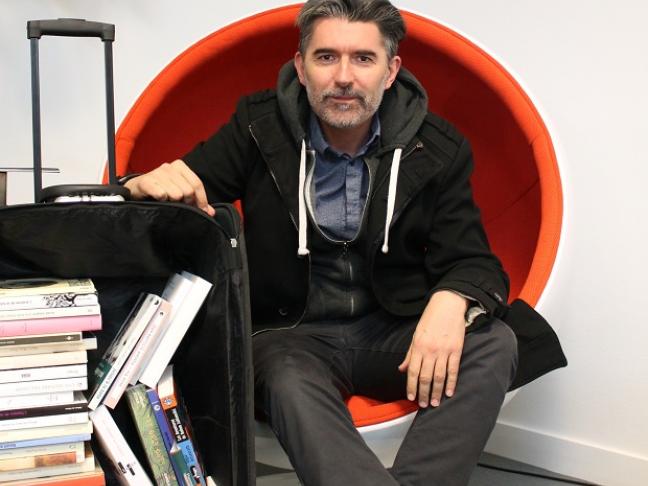 Guénaël Boutouillet parcourt villes et campagnes chaque automne, muni d’une grosse valise pleine de livres.
