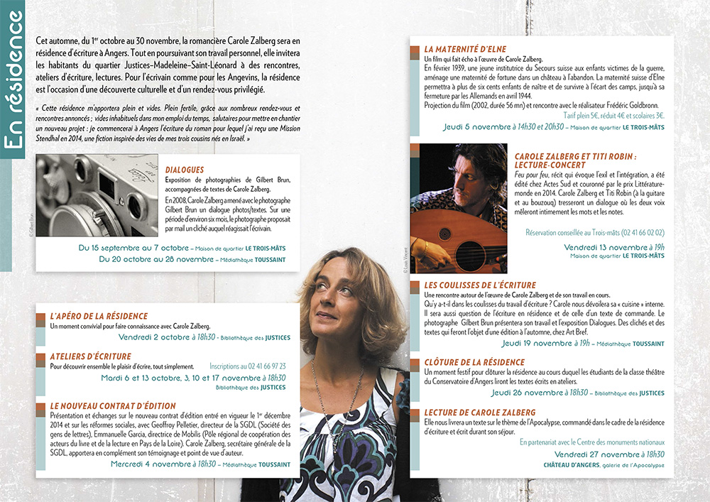Cet automne, du 1er octobre au 30 novembre, la romancière Carole Zalberg sera en résidence d’écriture à Angers.