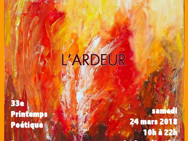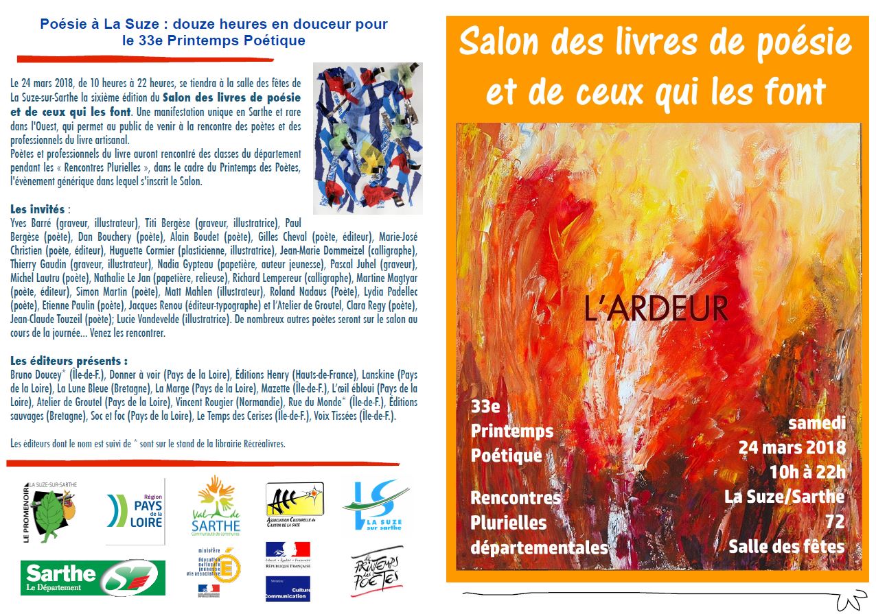 Pour la 33e édition de son Printemps Poétique, la Suze organise le samedi 24 mars 2018, de 10 heures à 22 heures, le Salon des livres de poésie et de ceux qui les font. Poètes, éditeurs, libraire, et professionnels du livre artisanal, de la fabrication du papier à la typographie en passant par l'illustration, la calligraphie et la reliure, tous vous attendent pour 12 heures de douceur, avec des démonstrations, des animations, des "choses" à faire… Une table ouverte où vous serez, à 19 heures, nos invités pour le dîner à la bonne franquette et une lecture musicale en guise de (ou avec le) dessert : "Deux quarts d'heure d'ardeur".