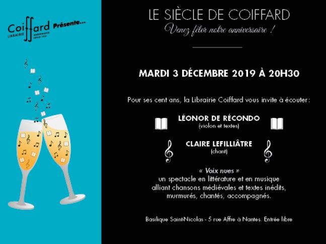 Pour ses cent ans, la librairie Coiffard vous invite à écouter Léonor de Récondo - au violon et texte - et Claire Lefilliâtre - au chant - pour un spectacle en littérature et en musique alliant chansons médiévales et textes inédits, murmurés, chantés, accompagnés.