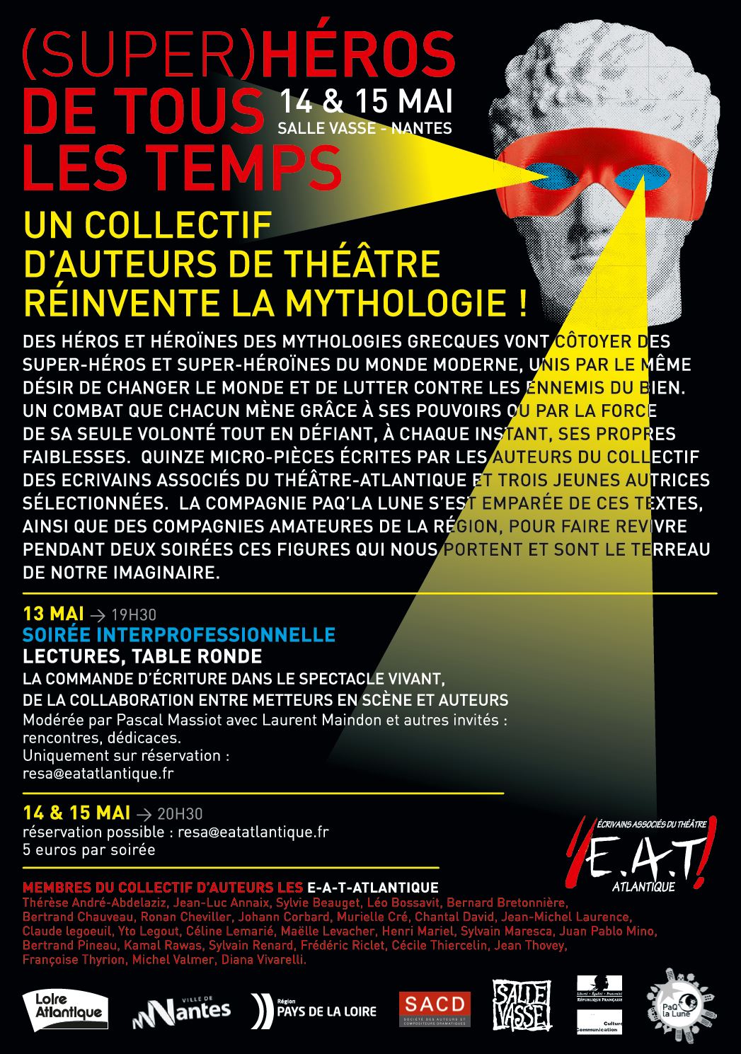 Les comédiens de la compagnie Paq’la Lune ainsi que des troupes de théâtre amateur interpréteront les textes extraits du tout nouveau recueil des auteurs E.A.T-Atlantique, (Super) Héros de tous les temps (éditions Color Gang, mai 2019).