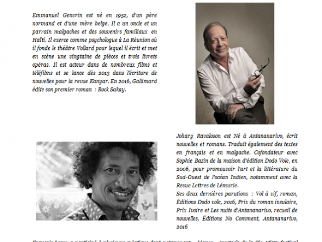D'île en île, de l'exil à La Lémurie, de l'altérité à une identité, de la tradition à la modernité, du français au créole, deux auteurs Johary Ravoloson et Emmanuel Genvrin nous racontent leurs parcours et au travers de de leurs oeuvres, une diversité culturelle mais aussi une identié insulaire de la littérature de la Grande île et des piles soeurs.