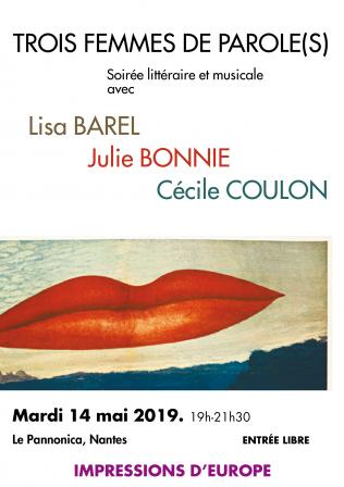 Le mardi 14 mai 2019, de 19h à 20h30 (ouverture des portes à 18h30), au cours d'une soirée littéraire et musicale intitulée « Trois Femmes de parole(s) », nous recevrons trois jeunes femmes qui toutes sont romancières, poètes, musiciennes ou ayant un goût prononcé pour la musique : Lisa Barel (piano), Julie Bonnie (guitare acoustique électrifiée) et Cécile Coulon (morceaux préenregistrés).