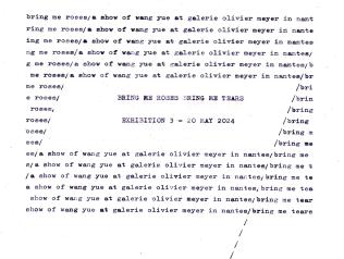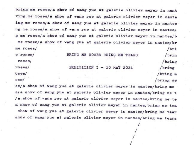 Pour sa première exposition personnelle Wang Yue présentera une sélection illustrant la transition de son travail d'édition vers la peinture et le passage d'une narration matérielle vers des récits moins tangibles, tout en restant consciente et attentive aux questionnements poétiques et politiques actuels.