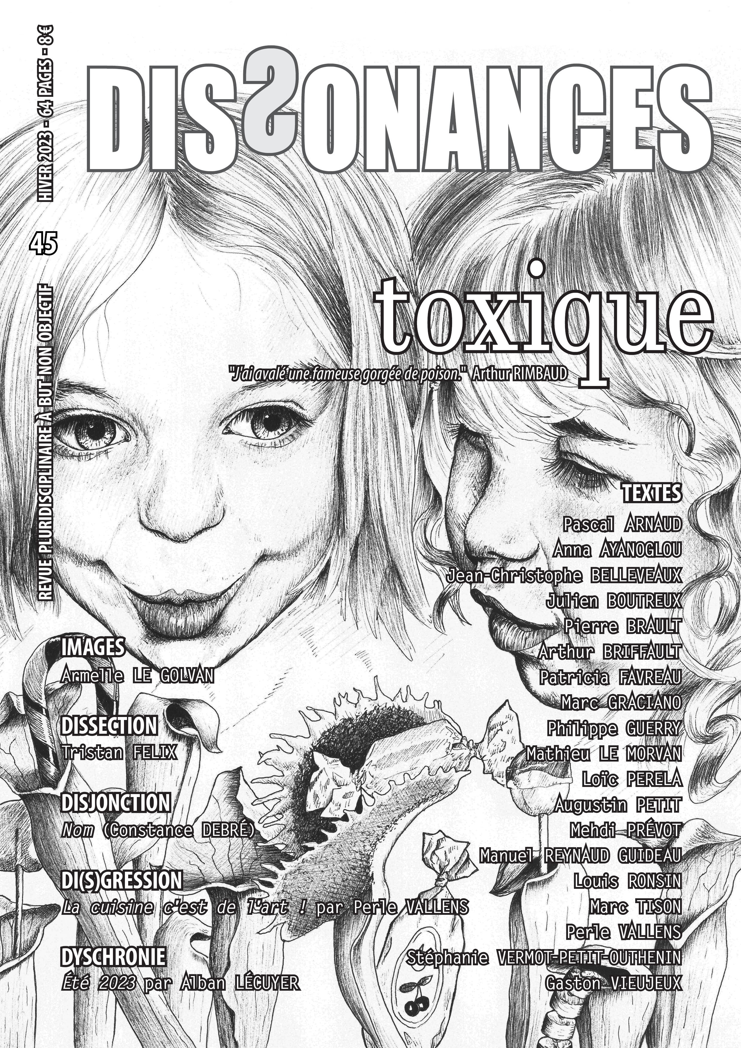 <p>Dissonances,</p><ul><li>est une revue thématique et semestrielle (parutions : avril et octobre) de création et de critique littéraires. Ses objectifs sont la découverte et la promotion de la littérature actuelle dans tous ses états.<br><br> </li><li>veut présenter pour chaque thème des points de vue et formes aussi divers que possible, des écritures fortes, des auteurs habités.<br><br> </li><li>a abordé les thèmes « les Etats-Unis », « l’Europe », « la Religion », « le Sexe », « la Mort », « la Folie », « la Laideur », « l’Argent », « le Futur », « la Merde », « l’Amour », « la Peur », « Ivresses », « l’Autre », « Insurrection », « Masques », « Entrailles », « Idiot », « Maman », « le Vide », « Rituels », « Superstar », « le Mal », « la Peau », « Animal(s) », « Orgasmes », « Ailleurs », « Tabou », « Que du bonheur ! », « Nu », « Fuir », « Traces », « La Honte », « La Vérité », « Impur », « Feux », « Mutations », « Conflits », « Opium », « Champagne ! », « Trans- », « Silences », « Toxique », « Fragile »...<br><br> </li><li>est née en 2002 et en est à son numéro 46.<br><br> </li><li>réserve sa partie « création » aux textes reçus à dissonons@revuedissonances.com où ils sont tous anonymisés (y compris ceux des animateurs de la revue) avant d’être proposés au comité de lecture : connus et inconnus, proches ou pas, tous les auteurs intéressés ont les mêmes chances de s’y faire publier.<br><br> </li><li>illustre sa partie « création » par carte blanche donnée à un.e seul.e artiste par numéro.<br><br> </li><li>propose une partie « critique » en six rubriques : « dissection » où un auteur « connu » répond à un questionnaire fixe (il y a eu Hubert Haddad, Lucien Suel, Mathieu Riboulet, Abdel Hafed Benotman, Valérie Rouzeau, Jude Stéfan, Albane Gellé, Claro, Edith Azam, Ivar Ch'Vavar, Antoine Emaz, Eric Pessan, Lambert Schlechter, Nicole Caligaris, Laurent Albarracin, Perrine Le Querrec...) / « disjonction » où quatre chroniqueurs rendent compte de leurs lectures d'un livre remarquable / « dissidences » présentant huit ouvrages coups-de-cœur parus en domaine francophone chez des éditeurs petits et moyens / « di(s)gression » consacrée à un domaine de création autre que la littérature / « d'Istanbul à Rio » qui élargit nos « dissidences » au domaine étranger / « dyschronie » qui raconte les 6 mois écoulés sous forme de "journal intime" et "chronique du monde"</li></ul>