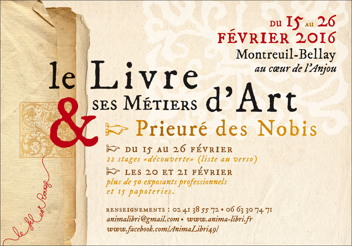 <p>Anima Libri propose une manifestation nationale, artisanale et culturelle dédiée au livre et à ses métiers d’art en Pays de la Loire qui se déroule en février à Montreuil Bellay (49).<br /><br />Calligraphie, enluminure, héraldique, typographie, gravure, illustration, imprimerie, fabrication de papier, marbrure, reliure, dorure, restauration de documents graphiques … sont déclinées sous leurs diverses techniques et spécificités, des plus anciennes aux plus contemporaines. Elles présentent différents métiers des arts du livre qui constituent les maillons d’une chaîne entre l’écrivain, l’éditeur et le libraire.<br /><br /><strong>Programme de l'édition 2016</strong><br /> <br />Le salon 20 et 21 février avec plus de 50 exposants professionnels dont 42 artistes et artisans d’art, des libraires, des écrivains et des fournisseurs d’outils et de matières premières.<br /> Les ateliers ‘découverte’ proposés en Janvier aux écoles primaires de Montreuil Bellay, avec exposition sur le salon des travaux réalisés par les enfants.<br /> Les stages proposés à tout public, entre le 15 et le 27 Février. 22 stages d’initiation et de découverte de différents savoir faire, animés par quelques uns des artisans professionnels exposant sur le salon, se dérouleront dans divers sites au cœur historique de la ville.<br /> <br />Papoteries 15 petites conférences interactives, proposées par des professionnels pendant le week end du salon et tout au long des 2 semaines.<br /> <br />Le fil …est Rouge sera l’occasion d’une exposition sur le salon,<br />des créations déclinées sur ce thème 2016 par les artisans et par les enfants des écoles.<br /> <br /><strong>Objectifs</strong></p> <ul> <li> Développer la découverte du livre en tant qu’objet imaginé et manufacturé en valorisant des savoir-faire de professions parfois peu connues du grand public.</li> <li>Proposer un événement varié et de qualité à un public amateur ainsi qu’à des professionnels qualifiés.</li> <li>Créer un événement culturel récurrent et hors saison sur le Saumurois.</li> </ul>