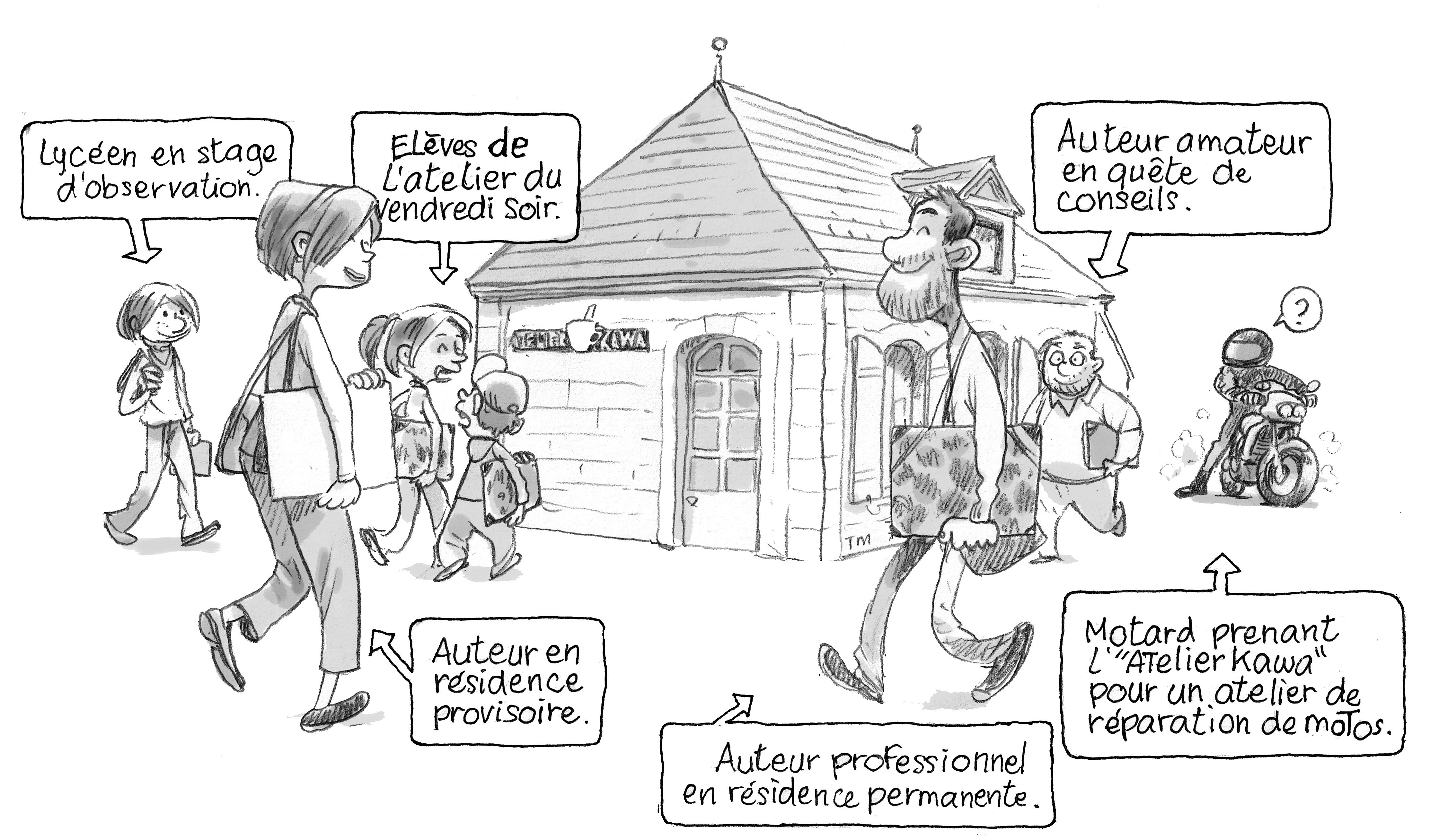 <p>L’Atelier Kawa est un lieu dédié à la BD et à la création graphique où les professionnel.le.s se retrouvent pour travailler et échanger sur leurs projets. C’est aussi un endroit convivial dont la porte est grande ouverte à toutes celles et à tous ceux qui veulent des conseils ou avoir un autre regard sur leur travail.</p> <p>L’atelier propose différents types de prestations : création et réalisation d’illustrations, de bandes dessinées, de logos, de dessins de communication, des concerts dessinés, des battles de dessin… Nous faisons aussi des interventions en milieu scolaire et des stages BD pour les ados (ouverts aussi aux adultes).<br /> <br /> Modalité d’accès aux stages : à partir de 11 ans.<br /> Adhésion à l’association obligatoire.</p>