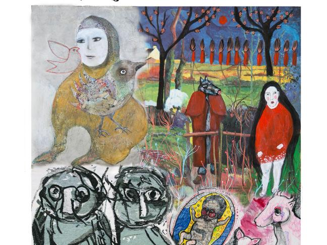 Chez Delphine Cadoré une attirance pour les arts primitifs est manifeste. Ses créations oscillent entre récit des origines et conte de fées, ce que confirme la présence du loup, des oiseaux de nuit, présences totémiques de visages humains, postures rituelles magiques d’êtres hybrides. Ces représentations favorisent les constructions mentales nourrissant l’imaginaire. Les couleurs, intenses, évoquent les éléments constitutifs du monde en création, l’eau, la terre, le feu, l’air.