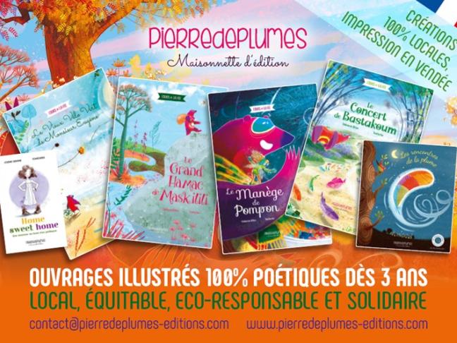 PIERREDEPLUMES propose des ouvrages aux tonalités joyeuses et pétillantes, aux illustrations immersives quasi-sensorielles, aux textes vibrants d’optimisme, alliant poésie avec un brin d'humour et de philosophie.
