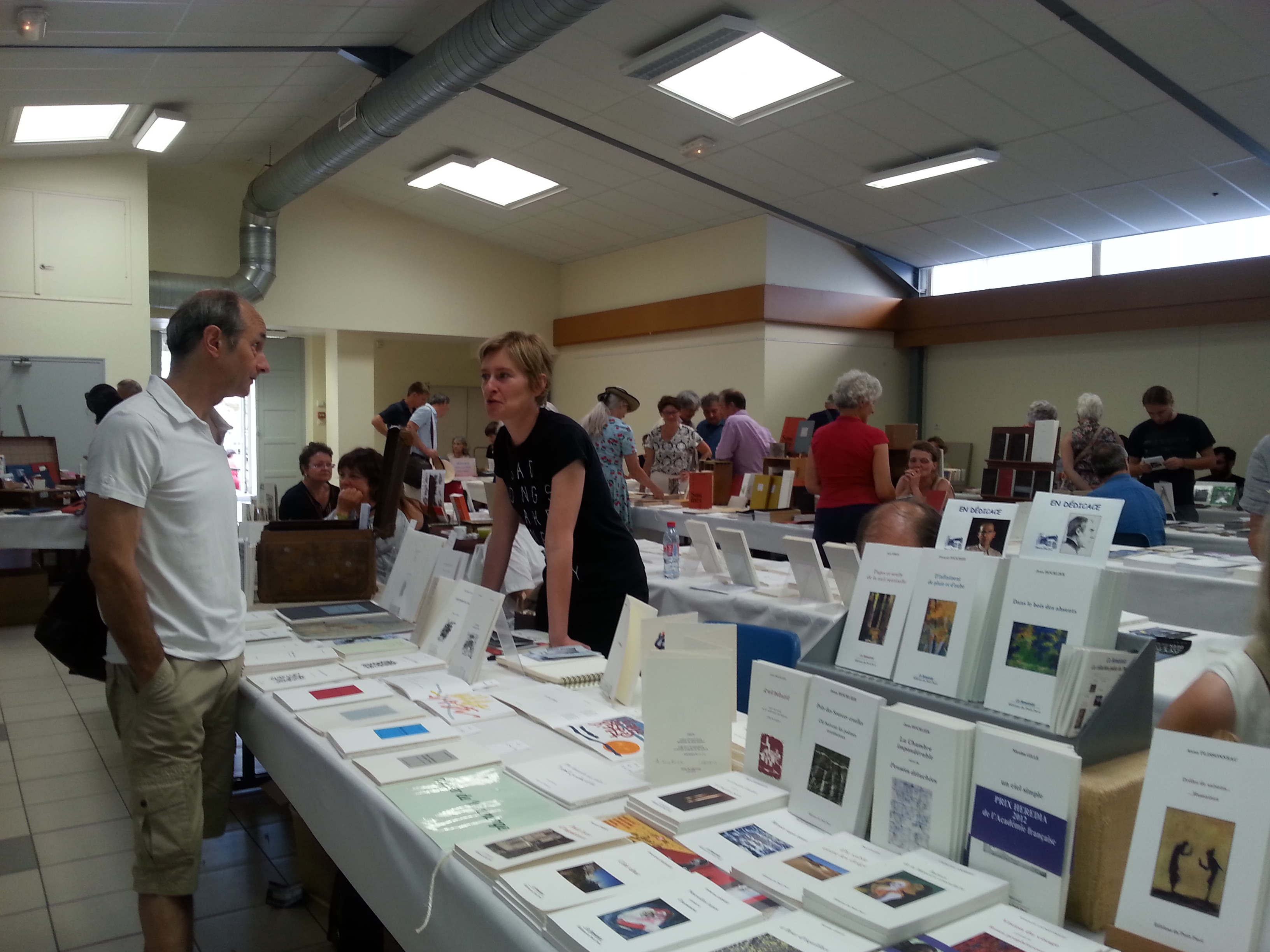 25 éditeurs de poésie, locaux ou qui publient des auteurs de la région ou encore amis fidèles, –La Dragonne, Rougerie, Le chat qui tousse, Les mots migrateurs, Isabelle Sauvage, etc… –tiennent salon dans la salle communale.