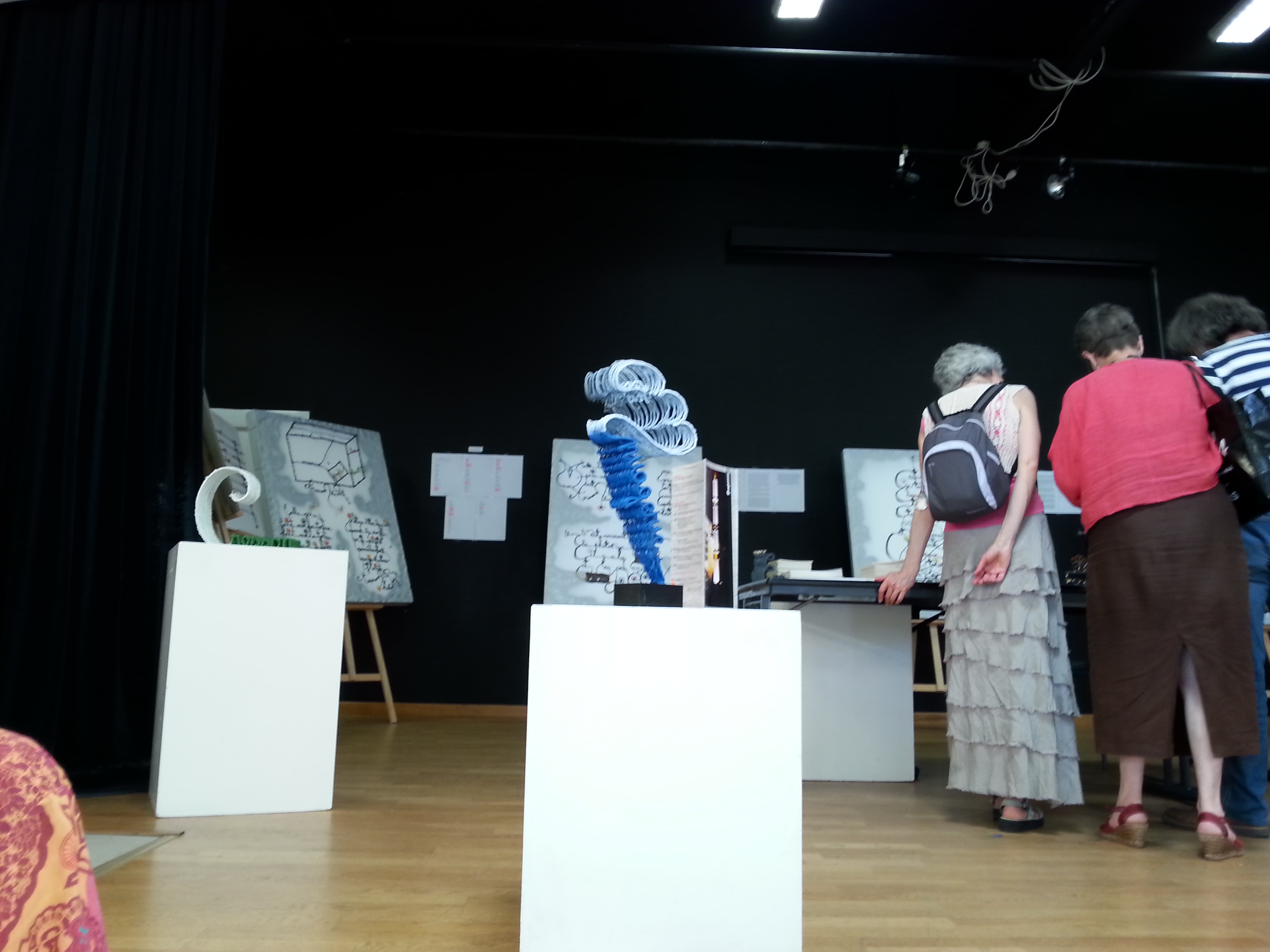 Sur la scène sont exposées les Poémétals de Guypierre, sculpteur sur métal toulousain qui a réalisé des œuvres monumentales, mises en place sur des ronds-points et dans l’espace public de plusieurs villes.