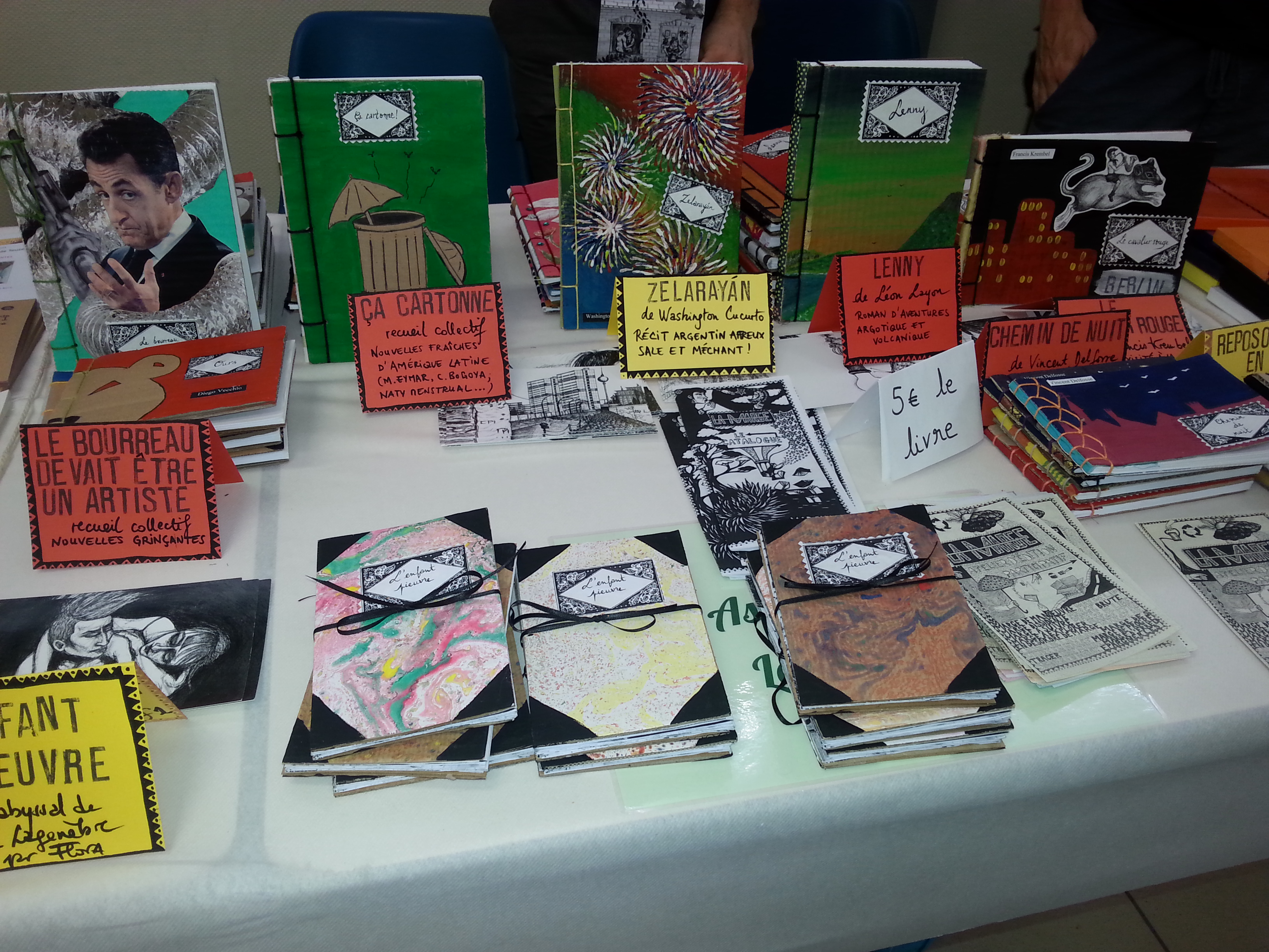 Dès l’entrée, impossible de rater l’association La Marge et ses livres réalisés sur des matériaux de récupération, dans la tradition des cartoneras d’Amérique du sud. Les textes sont d’auteurs locaux –Léon Layon, Francis Krembel auteur et éditeur (Editions Traumfabrik)- ou sont traduits d’auteurs de langue espagnole issus de la mouvance cartoneras. Au stand de la librairie Contact c’est le très accorte David Dumortier qui accueille le public et assure sa promotion avec talent et humour. Un peu plus loin Jean-Claude Bernard des éditions cannoises Encre et Lumière présente ses réalisations : un magnifique livre d’artiste qui réunit un texte de Philippe Rahmy et le travail de la plasticienne Sabine Oppliger.