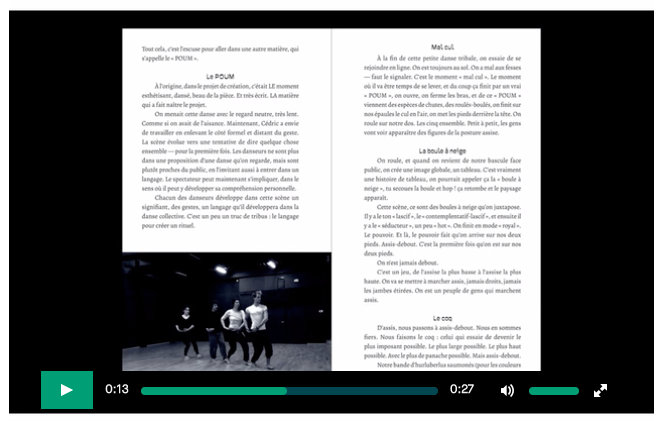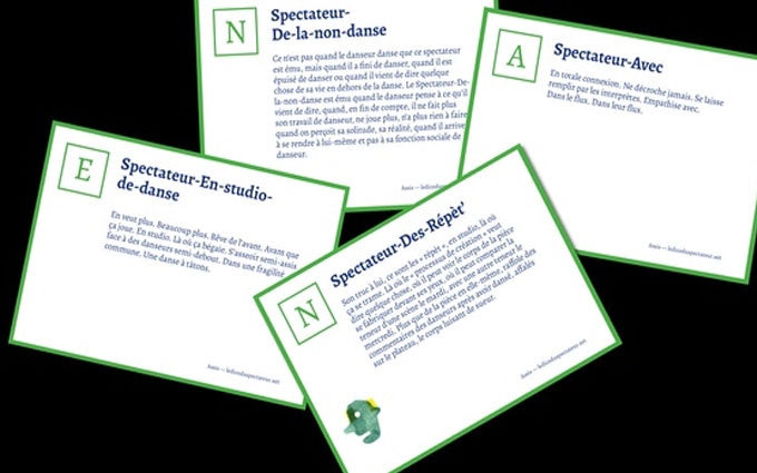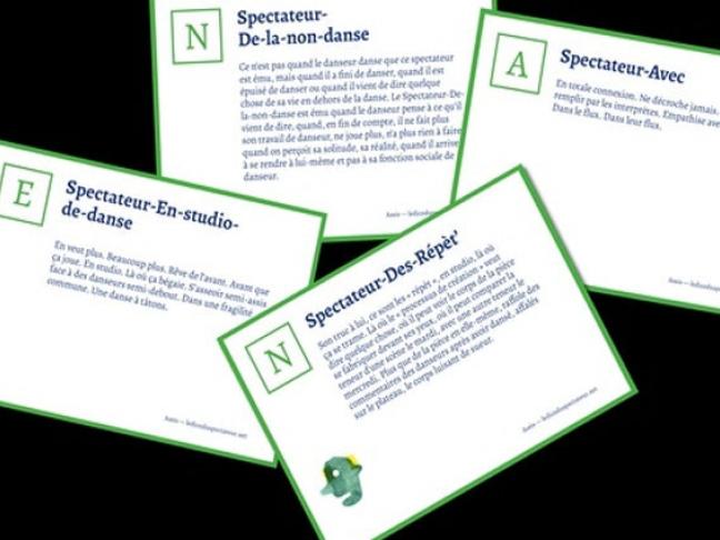 Il s'agit d'un projet d'ouvrage littéraire de danse, un voyage photographique au cœur de lieux culturels. Chaque chapitre du livre présente un style propre d'écriture, associé à des photos de contextes, parfois quelques dessins réalisés par des contributeurs. En insert, sous forme de petite pages émergent des définitions théorico-rigolotes issues du Dico du spectateur : spectateur-de-la-non-danse, spectateur-néo-spectateur, spectateur-à-temps-partiel...
