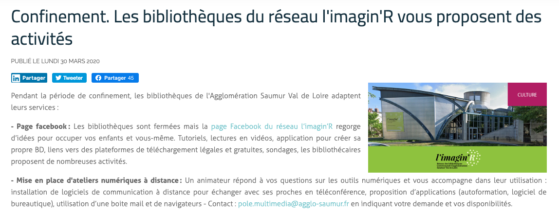 Pour faire découvrir cette offre foisonnante aux usagers, les professionnels redoublent d’inventivité et proposent de nouvelles actions de médiation - ou tout du moins, des actions de médiation renouvelées par l’utilisation de nouveaux outils : heures du conte sur Youtube, création d’un compte Twitter spécial #confinement, de blog ou de page de site dédiée à la situation sanitaire.