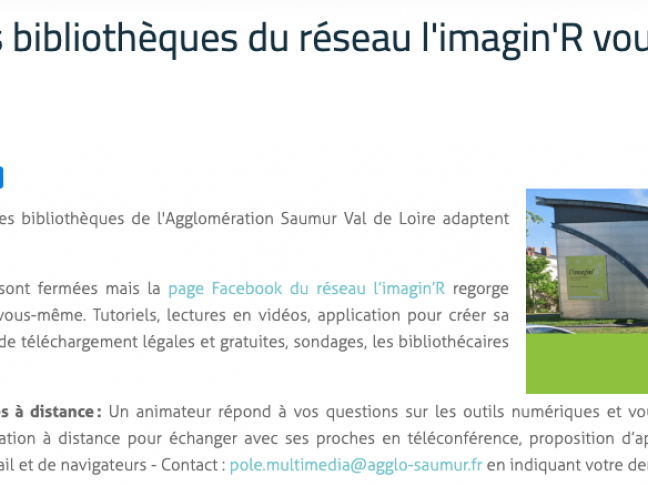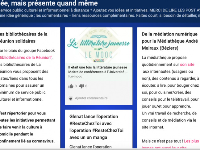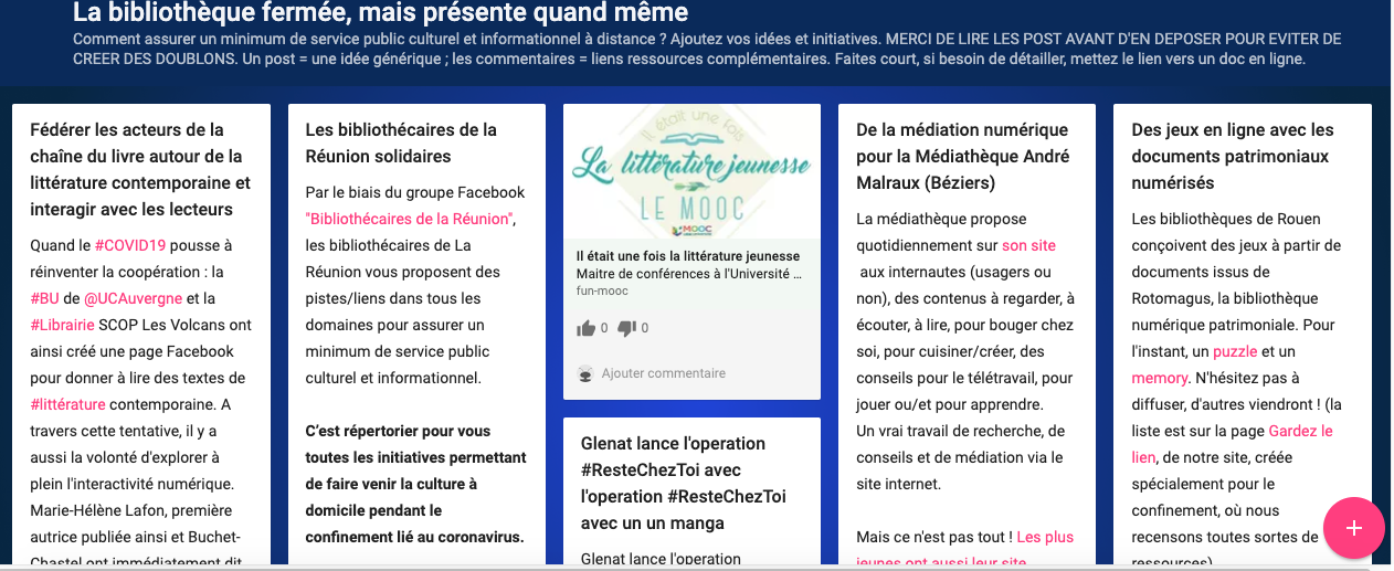 L’Association des bibliothécaires de France a créé un Padlet intitulé « La bibliothèque fermée, mais présente quand même ». Cet outil en ligne permet un recensement collaboratif des actions mises en place dans les bibliothèques françaises.