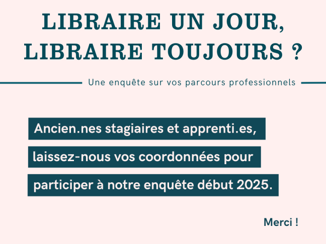 Si vous êtes concerné.e, que vous soyez toujours libraire ou non, vous pouvez laisser vos coordonnées via ce formulaire. L'Ecole de la librairie vous recontactera début 2025 pour une enquête en ligne.