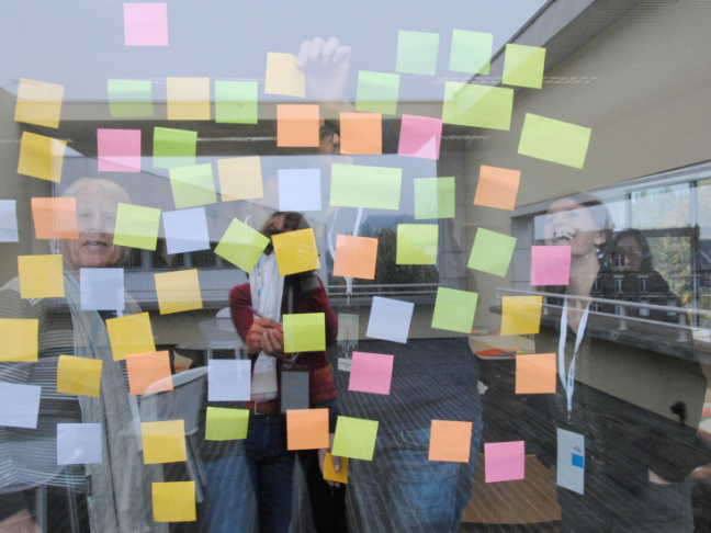 Et puis la première échappée belle proposée par François aux deux demi-groupes : que vous suggère le mot festival ? Post-it partout, post-it sur le tableau blanc, post-it sur la grande vitre coulissante de l’autre côté, mots-papillons cherchant la lumière. Et, à l’arrivée, tout un nuancier verbal, bien plus riche et subtil qu’une cinquantaine de gris : gourmandise, fête, blabla, partage, ennui, gratuit, ouverture, etc.