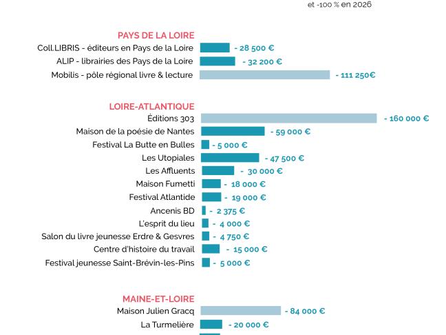 À noter que les dispositifs de soutien aux résidences comme Médicis, (qui favorise les résidences d’artistes sur 26 lieux en Pays de la Loire) ou les aides aux festivals et salons du livre sont supprimés dès 2025. Il est à craindre que les aides à la vie économique (maisons d'édition et librairies) le soient également. Ces chiffres ne reflètent que la situation des structures, mais toucheront par effet domino les artistes-auteur·ices, indépendant·es et autres prestataires, relié·es de manière interdépendante à ces structures.