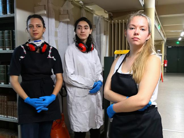 Rencontrons Aurélie, Léa, Audrey et Marie dans les magasins de la médiathèque du Mans. Elles nous expliquent en quoi consiste une opération de dépoussiérage de livres anciens.