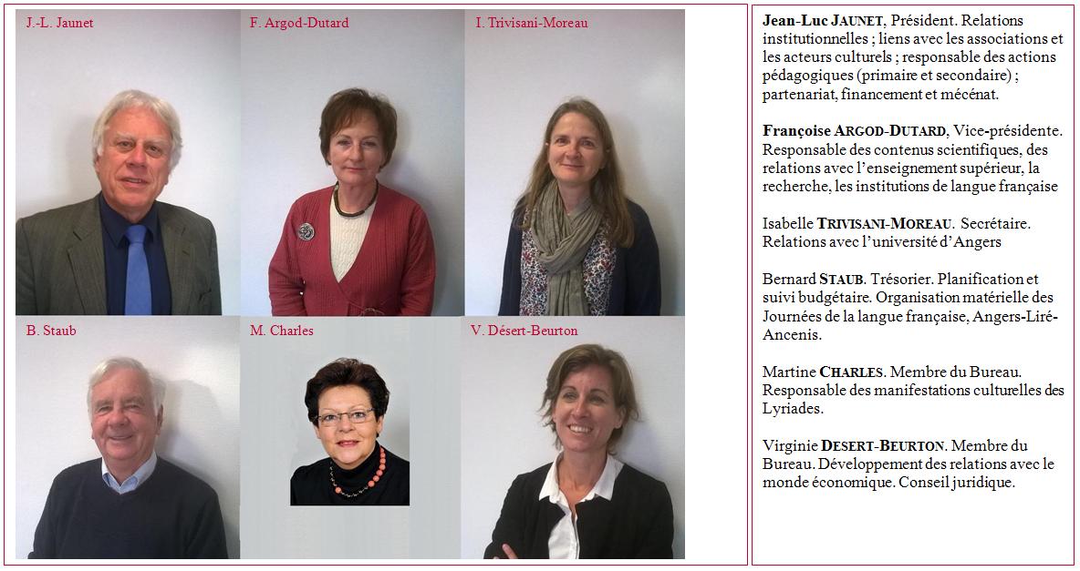 Pour l’accompagner dans ses missions, le nouveau président a constitué une équipe resserrée : le rôle de chaque membre a été redéfini précisément pour entrer dans l’action. Le bureau est à présent composé d’une directrice scientifique, d’une secrétaire, d’un trésorier qui sera aussi référent pour l’organisation des manifestations littéraires, d’une responsable des événements culturels et, enfin, d’une responsable des relations avec les entreprises. Le nouveau président se réserve le volet pédagogique des Lyriades, les relations institutionnelles, les recherches de mécénat et le développement des partenariats.
