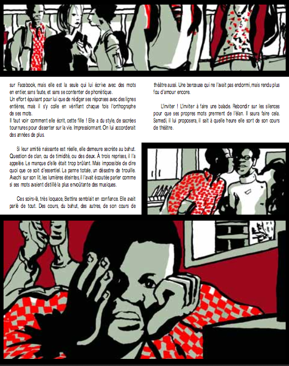 Codes du théâtre encore dans la suite du récit qui se déroule en alternant des scénettes, très parlées. On aime ces dialogues qui nous restituent la langue de nos ados. Et leurs préoccupations. Qu’y voit-on ? Rien de nouveau, sur la scène de théâtre du monde se jouent éternellement les mêmes intrigues: je t’aime, je ne t’aime plus, et comment le dire. Je t’embrasse, je ne t’ai pas embrassé, je ne t’embrasserai pas, tu en as embrassé un autre. . .