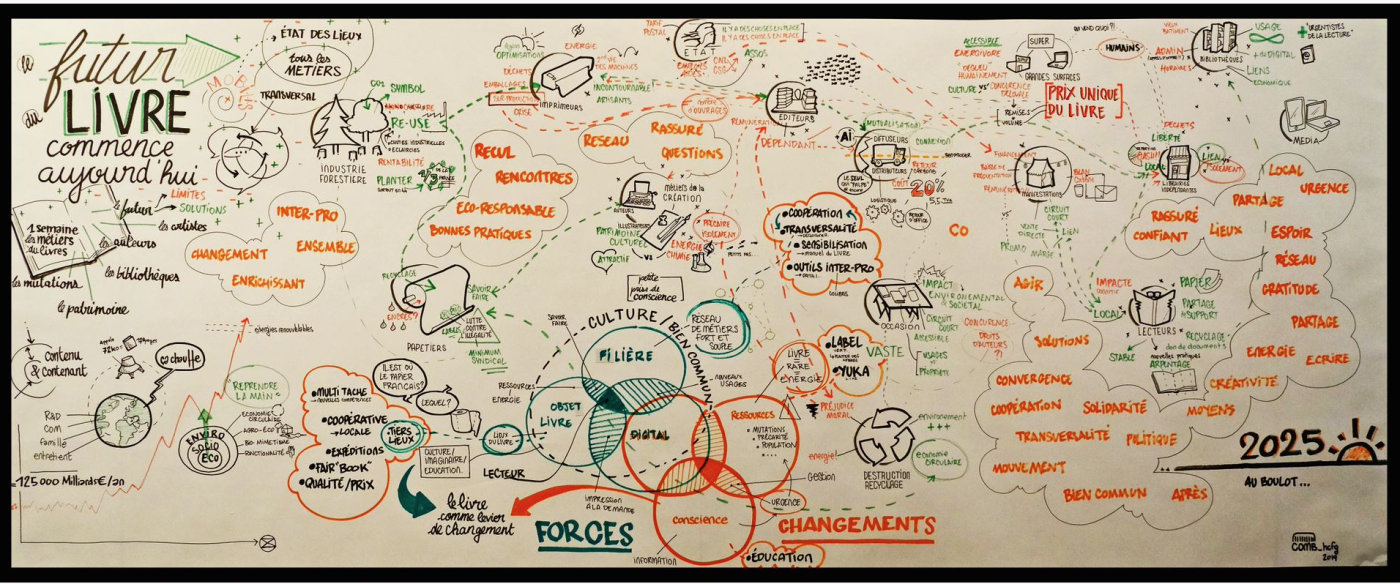 Il y a six années, presque jour pour jour, se tenait une journée particulière au Lieu Unique – le 11 juin 2019. Ce sont près de 70 professionnel.les du secteur du livre et de la lecture (éditeur·ices, bibliothécaires, libraires, auteur·ices, imprimerie, forestier, graphistes, médiateur·ices, étudiant·es...) qui ont planché une journée entière pour imaginer un futur plus soutenable pour la filière du livre en France.