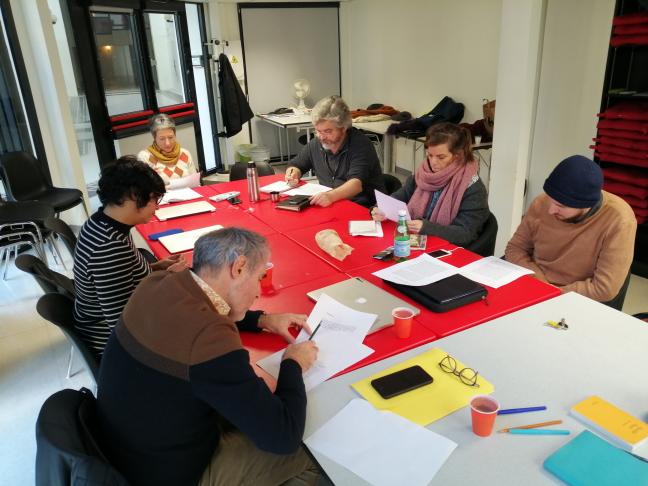 Une dizaine d'auteur.rice.s (issu.e.s du Pôle audiovisuel et cinéma régional La Plateforme) se réunit chaque lundi de 11h à 18h dans une salle de la médiathèque Jacques Demy (Nantes) pour écrire côte à côte leurs projets de création respectifs et pour échanger sur des problématiques et pratiques d'écriture.
