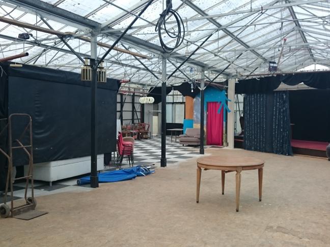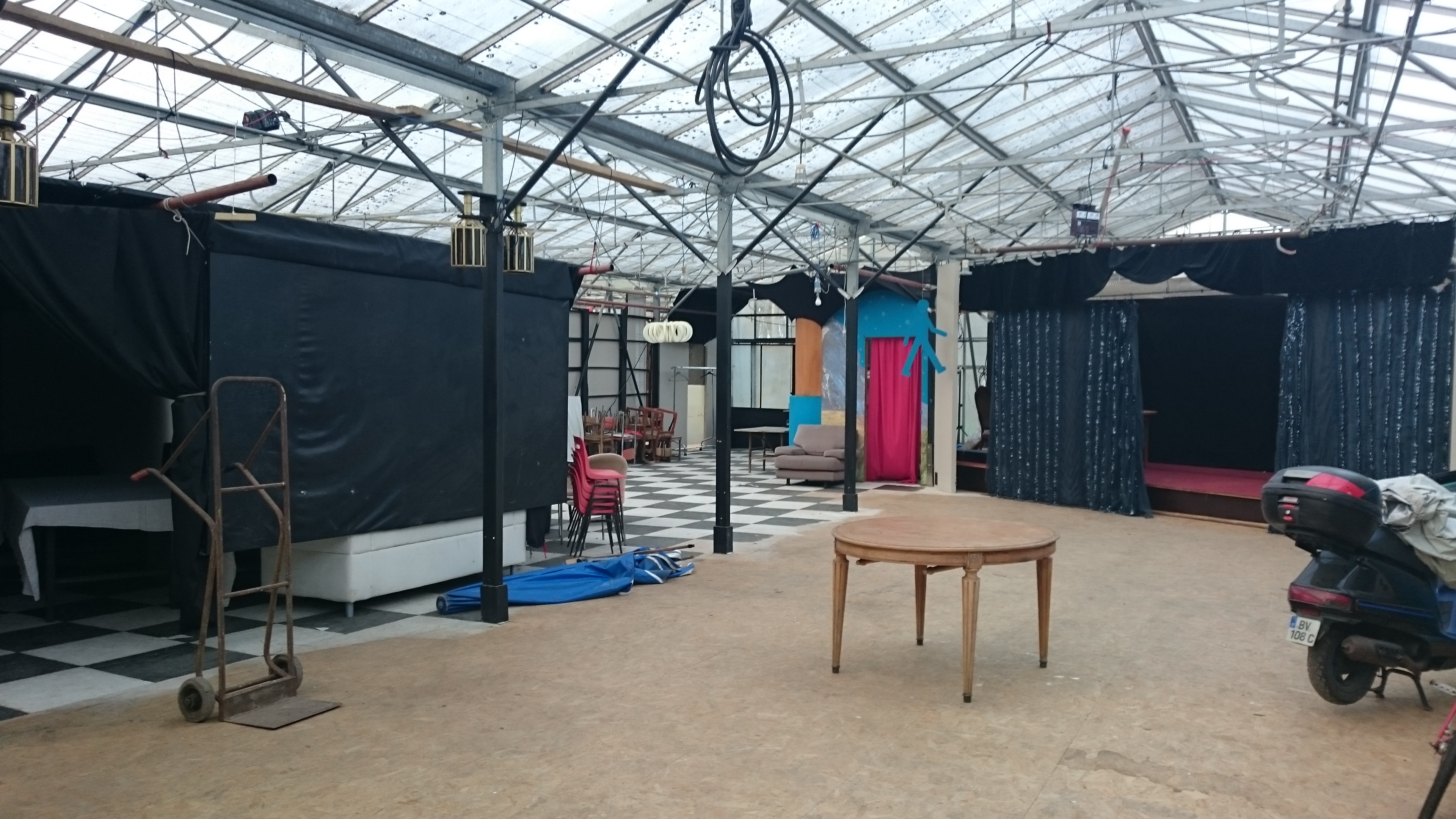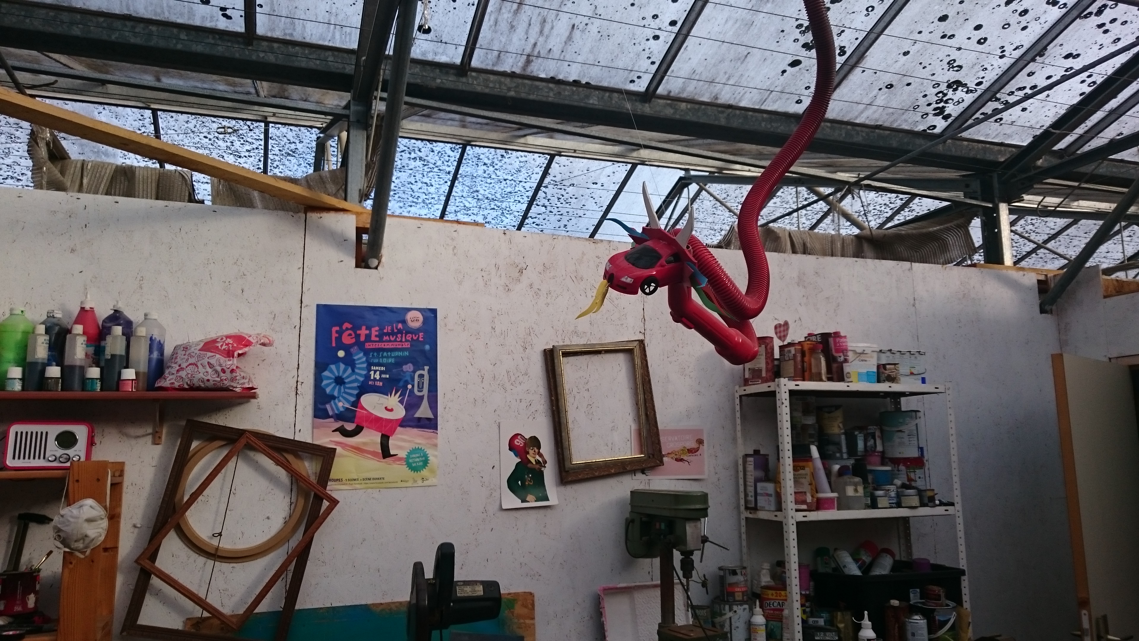 Mon atelier est installé au milieu d’autres ateliers d’artistes et d’artisans sous d’anciennes serres, en pleine campagne. Nous sommes assez nombreux, environ une vingtaine actuellement ─ et d’autres à venir ─, il y a même un garage ! J’y suis à la fois seul dans ma bulle et avec les autres. J’ai un atelier suffisamment grand pour avoir toute ma « nourriture » sous les yeux. Quand je suis ici, je travaille à 100 %. Le téléphone capte mal. Notre réseau téléphonique est mauvais et nous sommes isolés, ce qui n’est pas plus mal ! C’est aussi un lieu plein d’émulation. Avant j’étais seul chez moi, ou et plutôt solitaire, maintenant quand je bloque, je vais discuter avec mes « voisins », ça me permet de faire décanter les choses et de repartir. Il y a toujours quelqu’un pour partager ses compétences avec vous, et vous rendre encore plus efficace dans votre travail. Nous avons un lieu festif avec une scène où nous organisons régulièrement des soirées : concerts, spectacles. C’est un test pour ceux qui l’offrent aux autres, c’est un bon fonctionnement. Tout le monde se nourrit des autres mais a son propre espace propre.