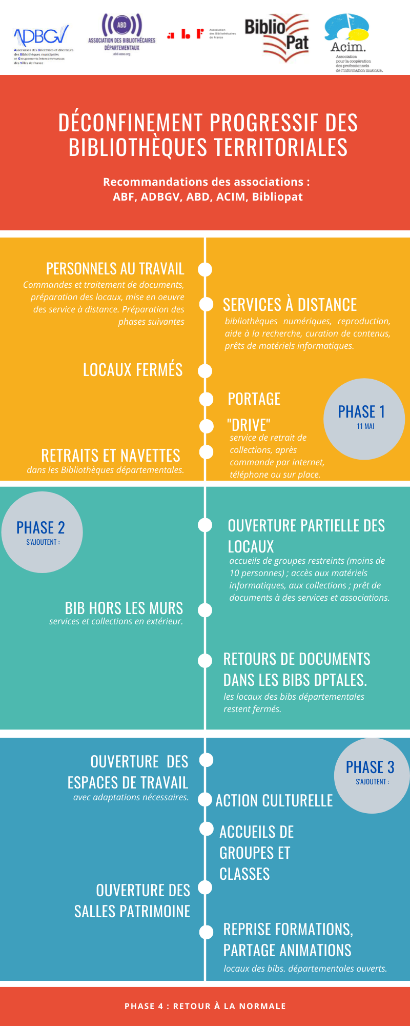 l’Association des bibliothécaires de France, l’Association des bibliothécaires départementaux, l’Association des directrices et directeurs des bibliothèques municipales et groupements intercommunaux des villes de France, Bibliopat et l’Association pour la coopération des professionnels de l’information musicale se sont associées pour rédiger des recommandations pour accompagner les professionnels des bibliothèques et les élus dans leurs processus de réouveture des bibliothèques.